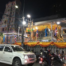 Across the road stands one of the eight Hindu temples in Bangkok. It seems like a function is going on. It is lighted up and we can hear prayers being chanted. As we get nearer, I wonder if I am in India. The chanting is in Sanskrit. Around the temple entrance stall holders are busy selling flowers and other prayer ingredients. The Sri Maha Mariamman Temple also known as the Maha Uma Devi was built in 1879. Inside, Durga Pooja is going on in earnest. We do a quick round of the Gods and return to our restaurant.