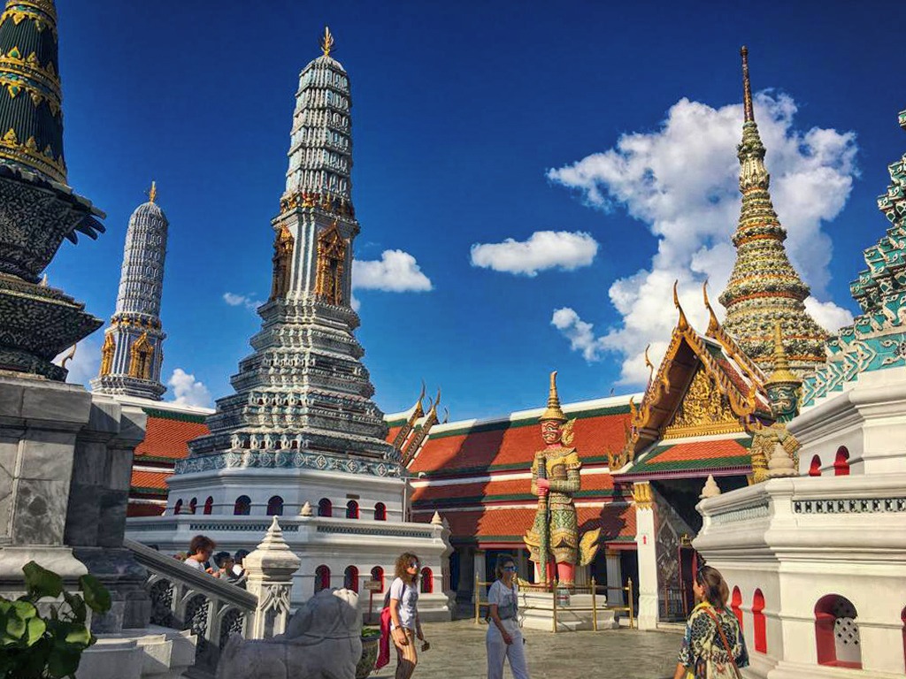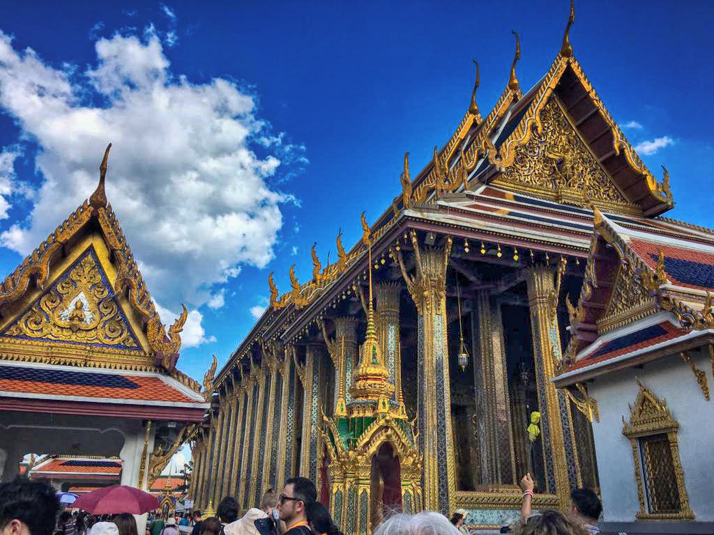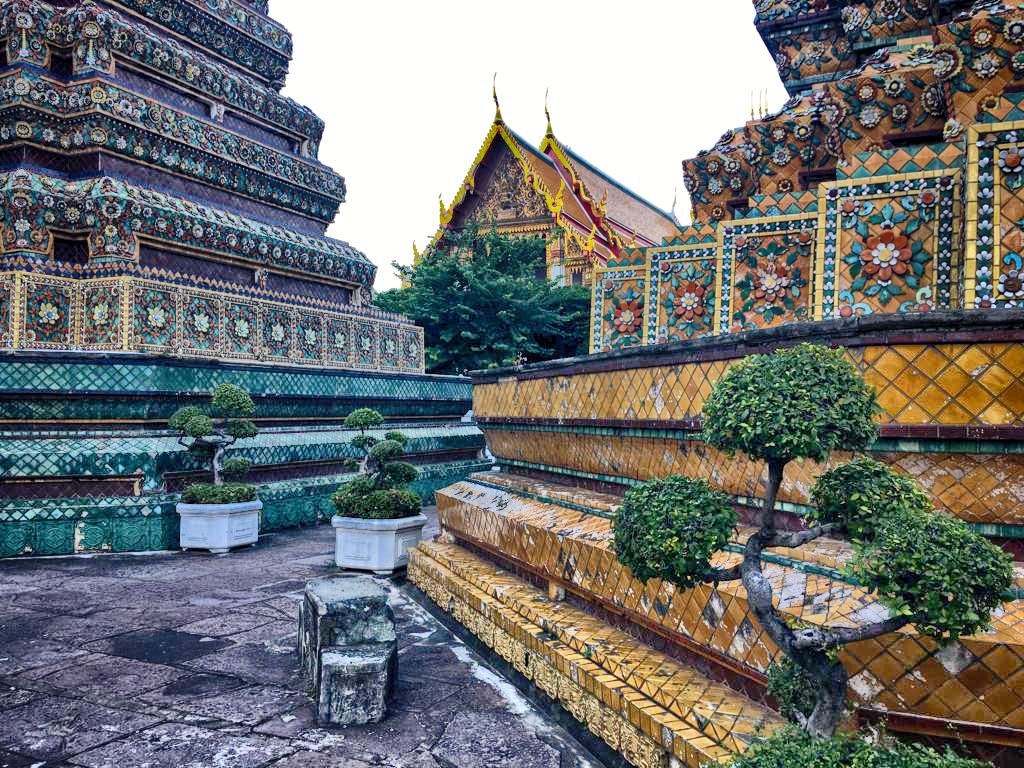 We make our way to the Grand Palace next. The Grand Palace Complex is a collection of buildings which include the royal residence, government offices and the Temple of the Emerald Buddha. The monarchy doesn’t live in the palace anymore although the building is maintained so that they can move in any time they wish to do so. The temple which houses the Emerald Buddha is located in the outer palace. As we walk through the entrance into the complex, and the buildings come into view, it is one of the most jaw-dropping sights. The outside of the buildings and temple are covered in coloured glass and mirror mosaics. The reflection of the sun’s rays from these mosaics make you feel as if you are in another planet. We climb the stairs into the temple. The inside of the temple is covered in paintings from top to bottom. The Buddha carved from a single Jade stone occupies prime position. Legend has it that the statue was discovered in 1474 in Chiang Rai, when lightning struck a temple. York takes us around the palace complex and along the gallery where the Thai version of the Ramayana epic is explained through murals. From here we walk the short distance to the temple of the Reclining Buddha or the Wat Pho.