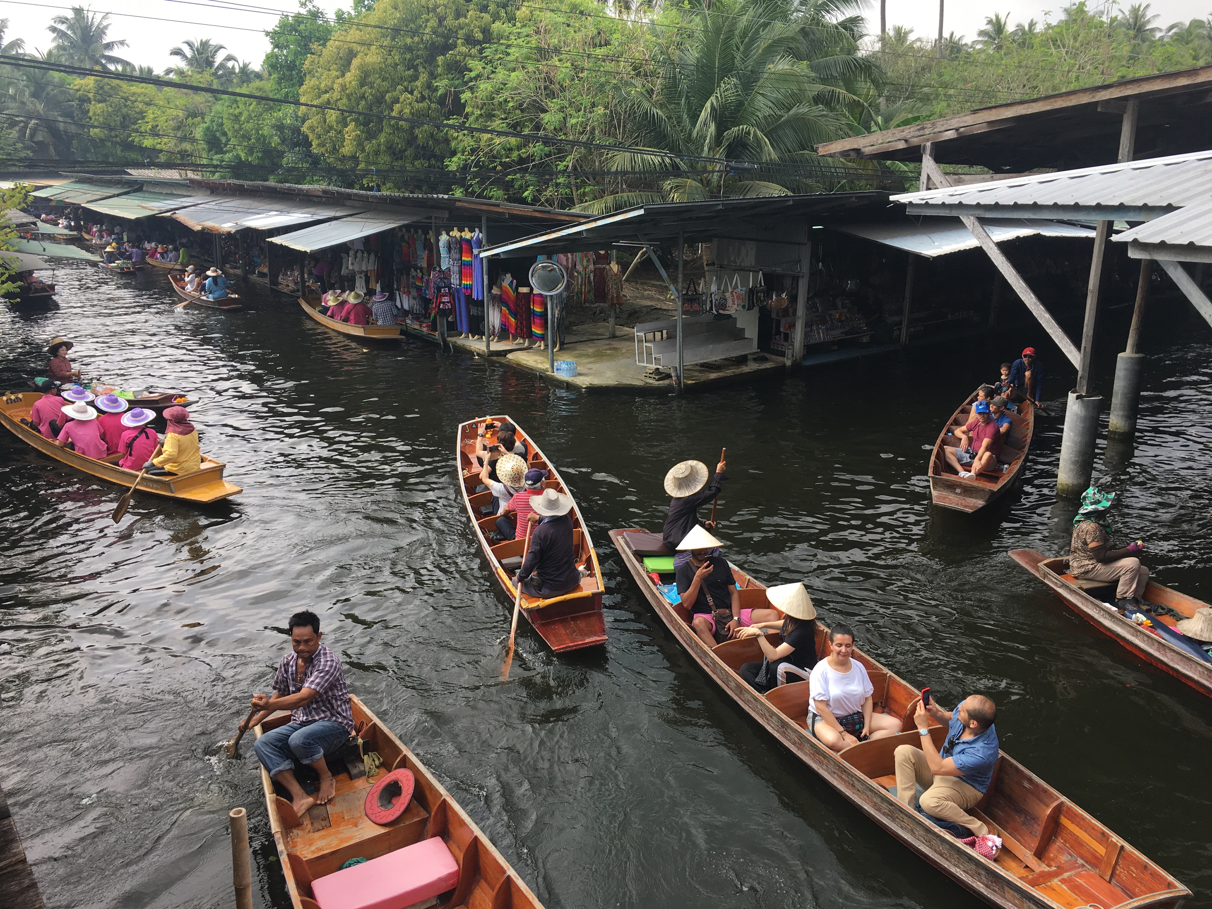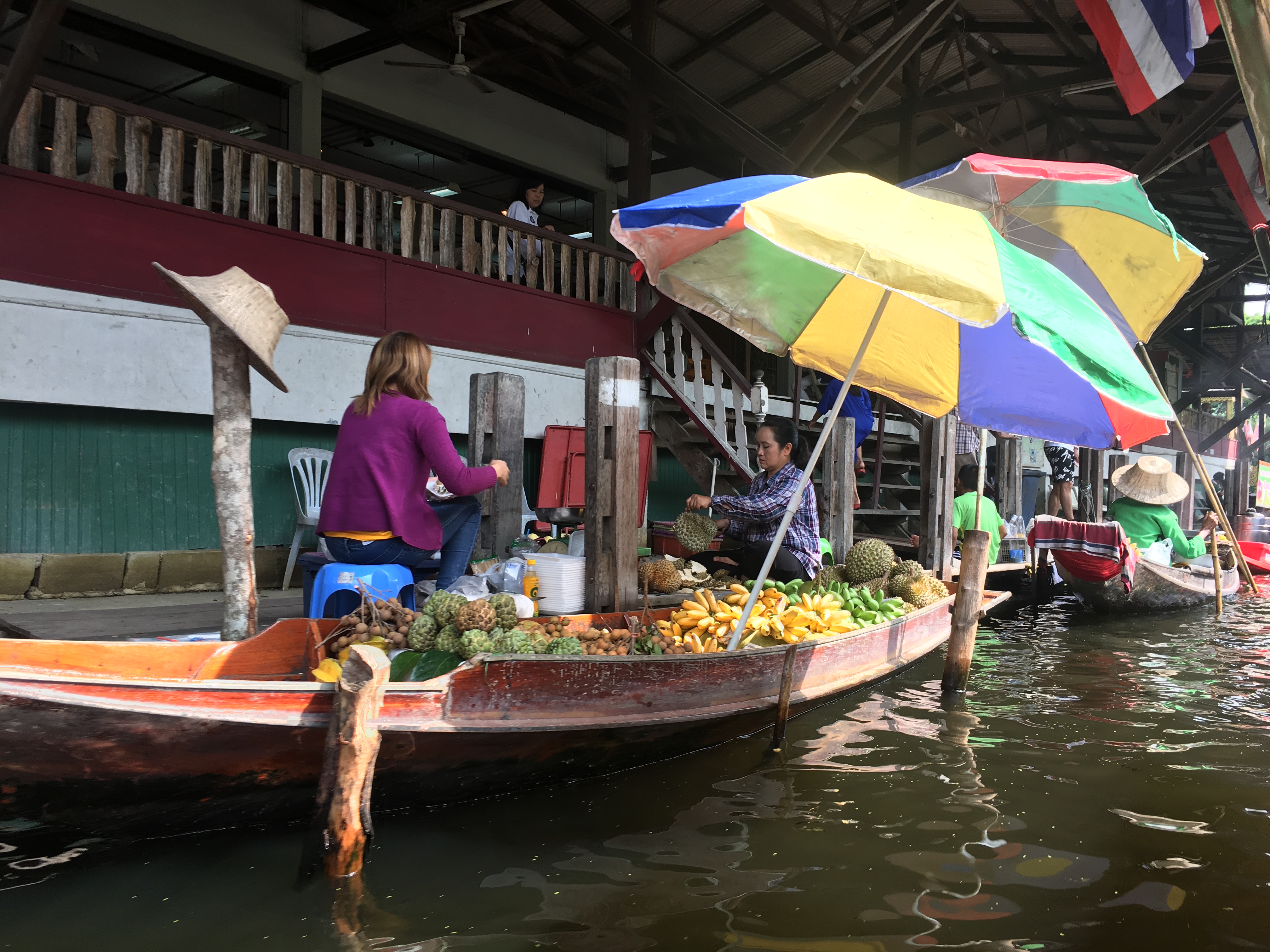In the nearby city of Mae Klong we pass the ‘Railway market’. We get a glimpse of the market as we drive past it. The market is located on a railway line. Food stalls line the track and people are happily doing business. When the train is about to pass the track the vendors need to swiftly get out of the way with their wares. The train slows down at this section. Not a very safe arrangement but so far nothing drastic has happened.